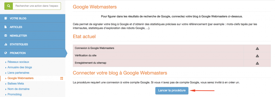 Pour cela rendez vous dans espace de gestion : PROMOTION > Google Webmasters et cliquez sur Lancer la procédure.